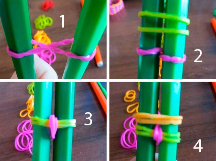Мастер-классНаденьте первую (розовую) резинку восьмёркой, затем ещё 2 (жёлтые) без перекручивания и скиньте восьмёрку в центр.