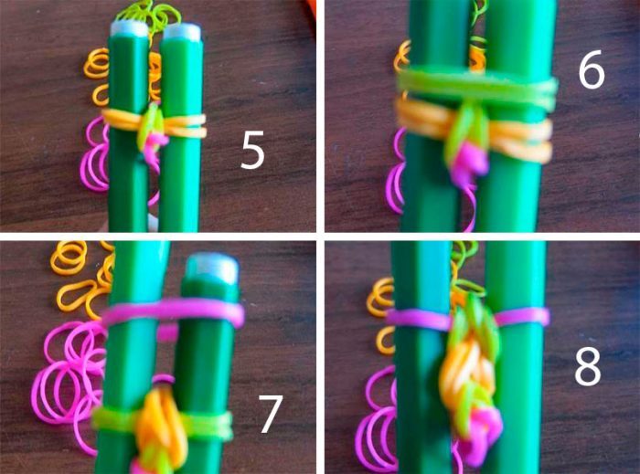 Пропустите пару через новую петлю, затем ещё одну пару сквозь 2 первые резинки на крючке, ещё 1 пару сквозь первые 2 петли, а четвёртую пару пропустите через все резиночки на крючке. Проплетите ещё 2 петли таким же способом.