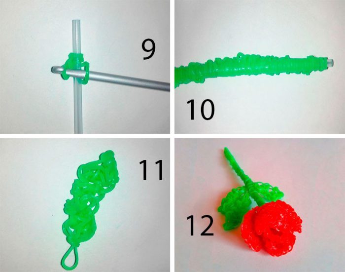 Прикрепите листочки таким образом: приложите листок к стеблю, оттяните последний узелок листочка, обмотайте им стебель один раз и просуньте листочек в этот узелок.Роза из резиночек готова!