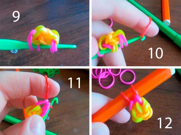 Наденьте ещё пару (оранжевых) и скиньте жёлтые на оранжевые.Наденьте ещё 2 жёлтые и одну розовую, затем перекиньте на крючок.