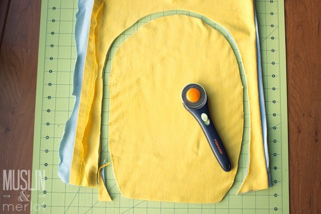 Закрепите булавками и прошейте в 4 см от внешнего края по кругу, оставив низ открытым. Не забудьте закрыть швы.