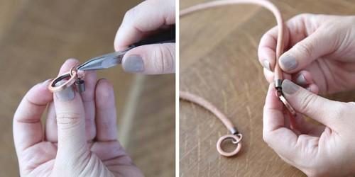 Откройте среднее кольцо, добавьте одну заглушку и большое замкнутое кольцо. Плотно закройте и добавьте немного клея, после чего вставьте конец кожаного шнура и дайте клею высохнуть. Действие необходимо повторить и с другой стороны.