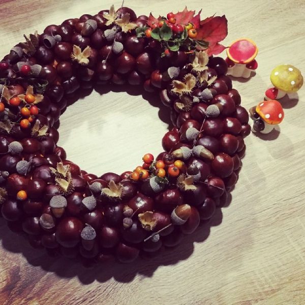 Отличное решение венка на дверь из каштанов и желудей.