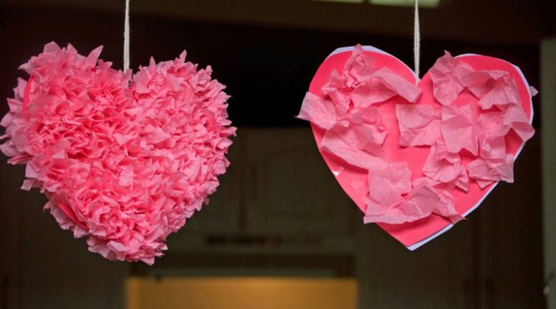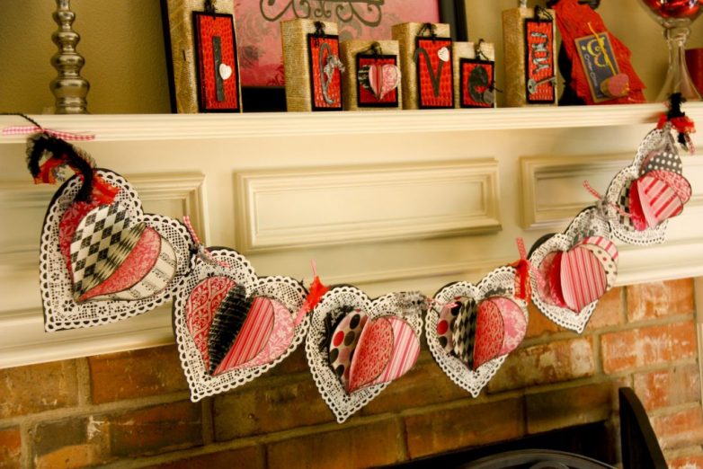 Отличный вариант для романтического ужина или украшения комнаты молодой девушки. Из бумаги вырезаются заготовки и крепятся друг на друга по 2 штуки. При этом верхнее сердечко сгибается посредине пополам. Элементы скрепляются ниткой, преимущественно – при помощи швейной машинки.