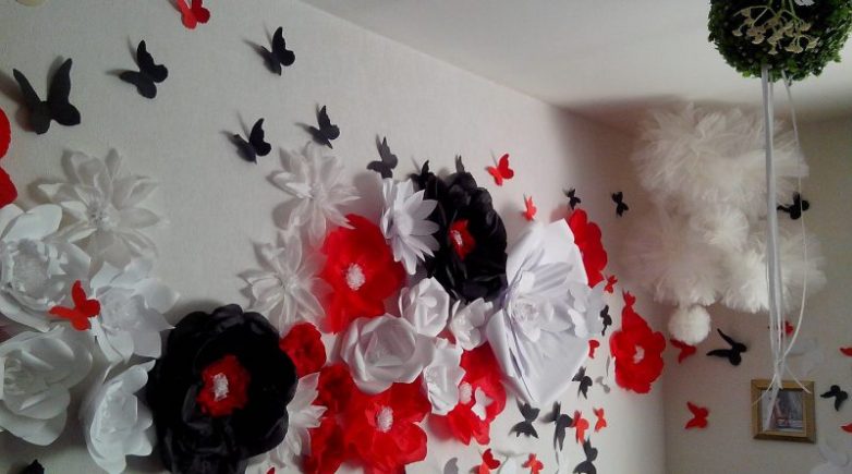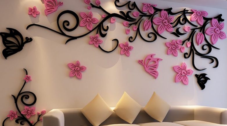 Цветочные декорацииВ качестве настенных украшений можно использовать цветочные мотивы в плоском или объемном виде. Для создания плоского декора удобно будет использовать трафарет, который можно купить или сделать свой. Затем нужно ровно и аккуратно вырезать все детали. Цветовая гамма и размеры при этом могут быть разнообразные.