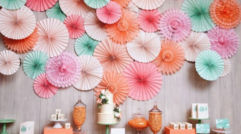 Хорошим украшением для комнаты, в которой будет проходить торжество, также будут вееры из бумаг. Они делаются путем складывания гармошкой, полоска сгибается пополам, внутренние концы соединяются скотчем или степлером. После распускания получается полукруг. Декорации крепятся на стену двухсторонним скотчем.
