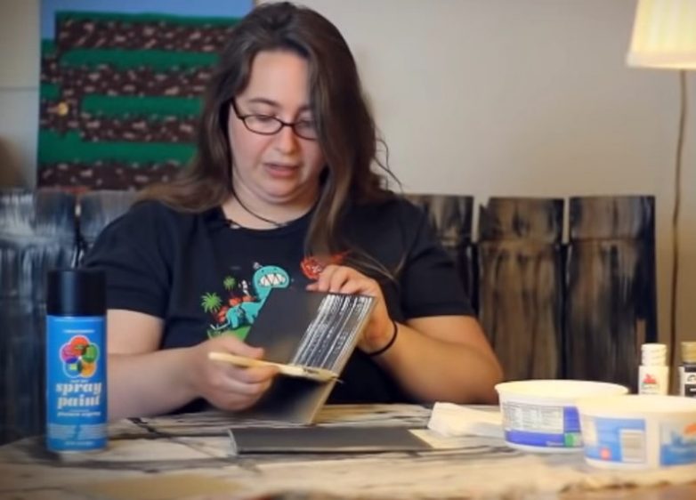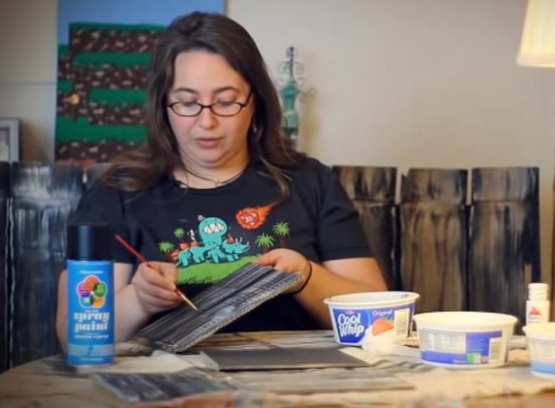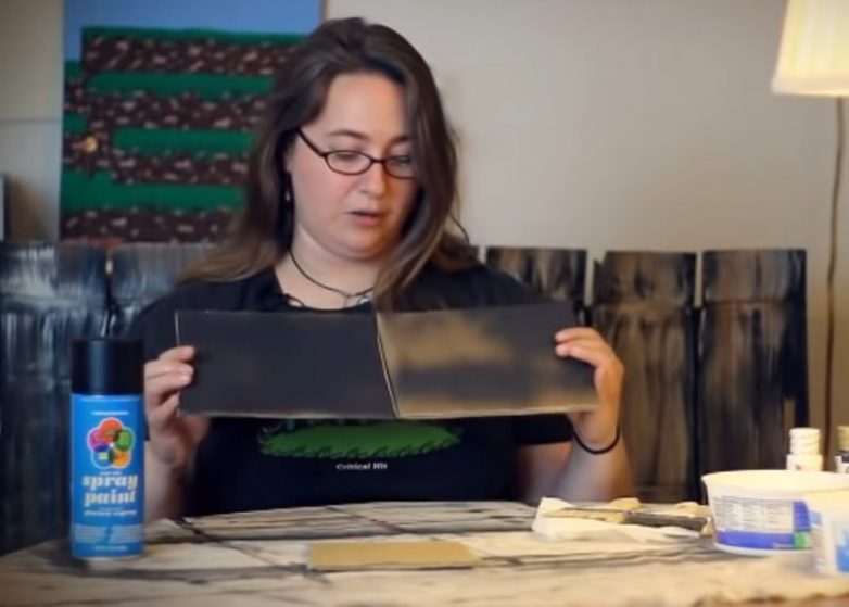 Для начала покройте рабочую зону старой тканью, чтобы уберечь ее от попадания краски. Неравномерно нанесите на картон слой черной аэрозольной краски.