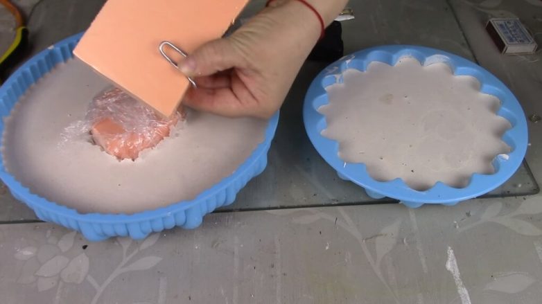Вырезанную для механизма форму оборачиваем пищевой пленкой, чтобы потом нам было легче отделить ее от гипса. В серединку силиконовой формы кладем кусочек соленого теста, так мы зафиксируем пеноплекс, приклеим его. Ставим сверху пресс, например, из банки с водой.