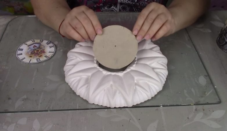 Циферблат будет не гипсовым, поэтому для него необходимо оставить место. Кроме того необходимо сделать выемку, куда будет помещаться часовой механизм. Для этого нам понадобится кусочек пеноплекса, из которого мы вырежем форму с такими же размерами, как и у часового механизма.