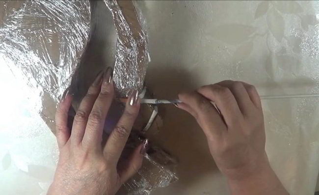 4. Обматываем кошку пищевой плёнкой, начинаем наматывать заранее скрученные газетные трубочки. Проклеиваем трубочки между собой клеем ПВА.