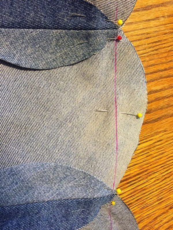 Я разрезала джинсы вдоль швов, при помощи миски. Отметила ровные круги на внутренней стороне ткани.