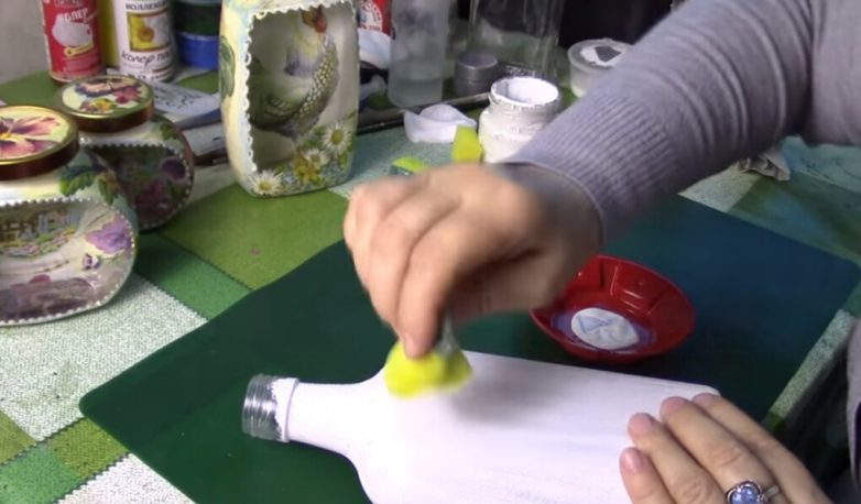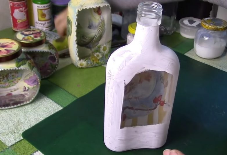 На следующем этапе покрываем часть бутылки акриловой краской, в нашем случае белой. Первый слой наносим кистью, довольно тонко. На этом этапе нужно решить, какого размера будет окошко. Если вы не смогли решить, закрасьте побольше, потому что убрать акриловую краску легко, а вот добавить так, чтобы было ровно – нет.