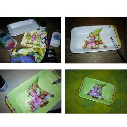 Очень интересно смотрится декупаж на пенопласте. В такой технике часто делают картины и даже украшения. Для работы вам понадобится только кусок пенопласта необходимого размера, трехслойные салфетки, клей ПВА, кисточка, ножницы и финишный лак. Делаются такие изделия быстро и не требуют специальных умений.