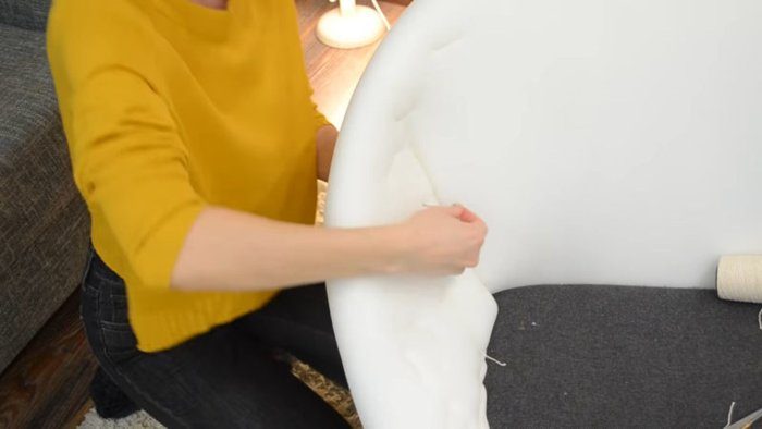 Следующий этап — обивка поролоном. Сшиваем поролон. Подстраиваем поролон со стороны спинки, подрезая ненужные части и сшивая оставшееся воедино.