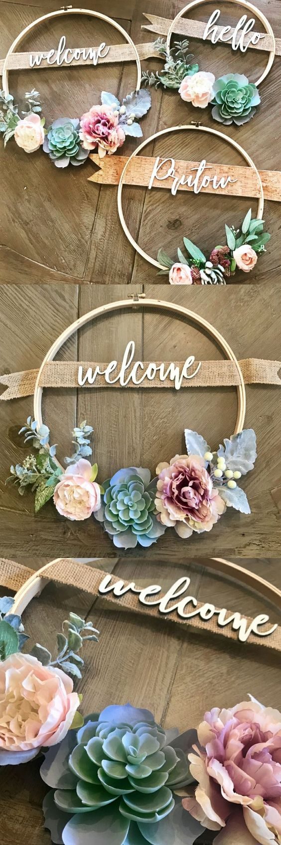 Круглые пяльцы можно использовать в качестве основы для создания приветственных табличек. Оформите обруч по своему вкусу, и получите дизайнерскую вещь.