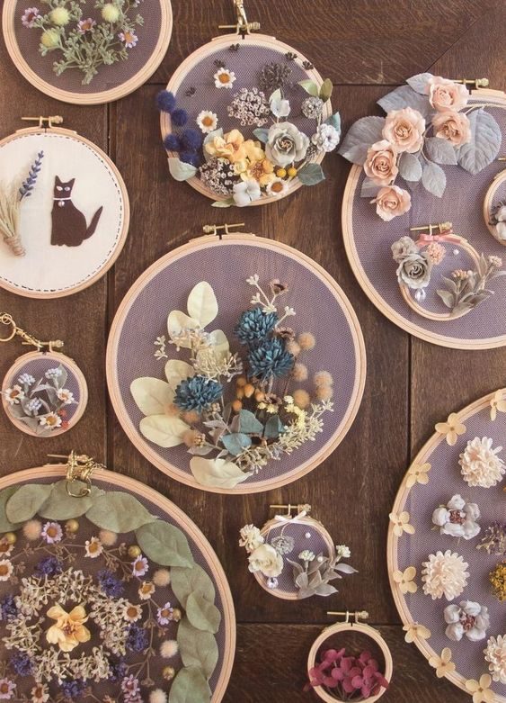 Элементы декора из пялец делаются очень быстро, выглядят очень дорого, но при этом стоят копейки. Используя разные материалы, Вы можете создать различные стилевые решения.