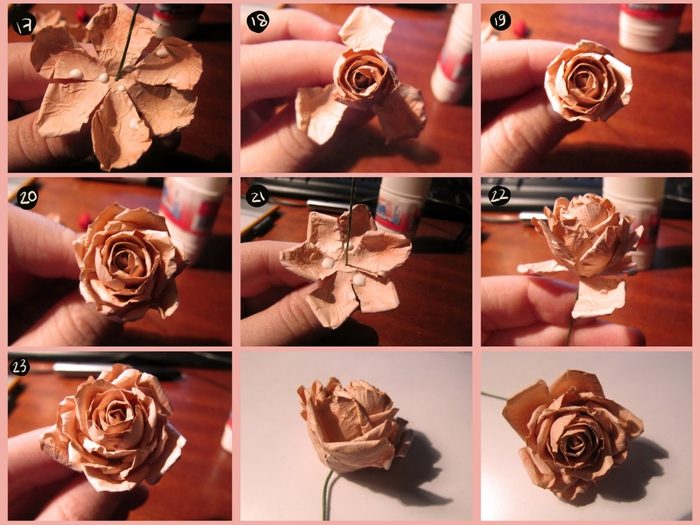 С намоченной, помятой и высушенной бумагой работать гораздо легче, чем с обычной, она легче поддается воздействию. Возьмите первые 6 лепестков, нанесите клей на серединку, насадите их на проволочку. Нанесите клей на один из лепестков, скрутите его конусом вокруг основы. Возьмите лепесток напротив и приклейте его, попарно приклейте оставшиеся лепестки. У вас осталось 3 заготовки лепестков. Подкрутите их как показано на картинке, это легко делается пальцами, на одной из заготовок подкрутите не все лепестки, а через один. Переверните заготовки закрученными концами вниз. Возьмите что-нибудь с шариком (0,5-1 см) на конце, и придайте лепесткам вогнутую, чашевидную форму. Возьмите одну из заготовок, где все концы подкручены, и нанесите клей, как показано на фото. Склейте лепестки друг за другом, чтоб получилась «чашечка», отложите её пока.