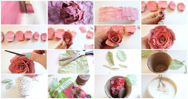 Красим офисную бумагу, мнем ее. Вырезаем лепестки и складываем розочку