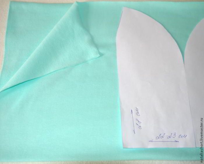 складываем снизу вверх, лицевая сторона ткани внутри (это будет 2 наших слоя шапочки)
