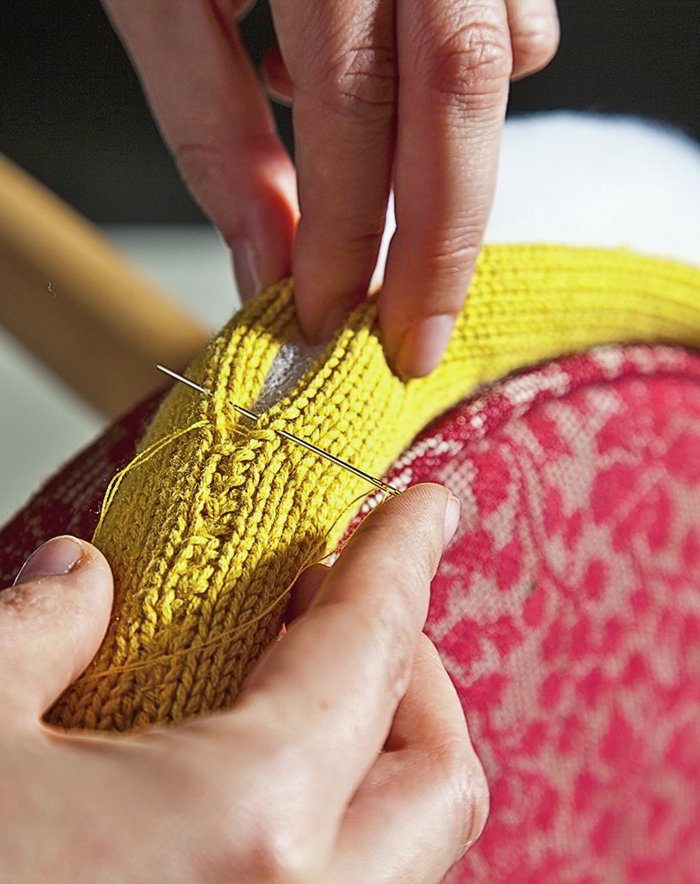 Пересматривая гардероб, не спешите избавляться от вышедших из моды или надоевших трикотажных вещей. Использовать их можно самым неожиданным способом. Взгляните на этот дизайнерский табурет. Сложно даже подумать, что оригинальная обивка раньше была невзрачным старым джемпером.