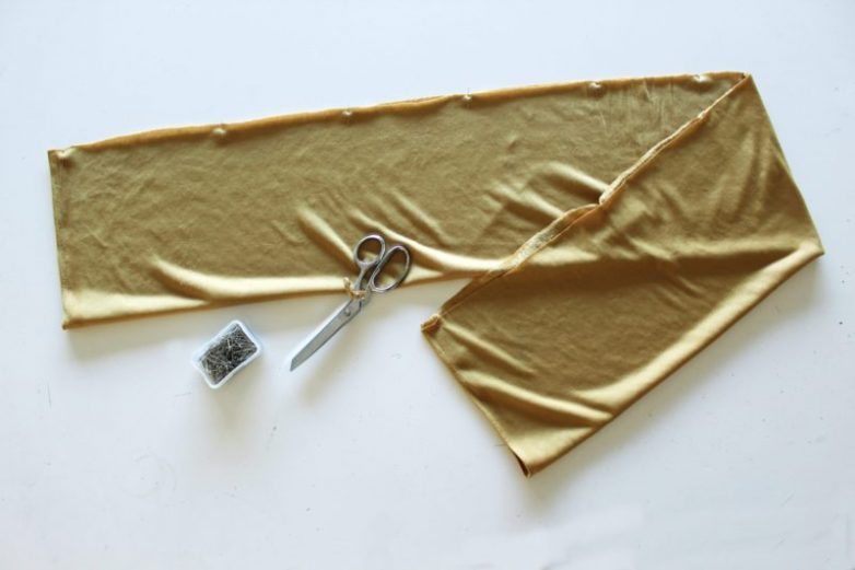 Для начала сложите подготовленную ткань изнаночной стороной вверх пополам по длинной стороне и сшейте края, в результате чего получится длинная труба.