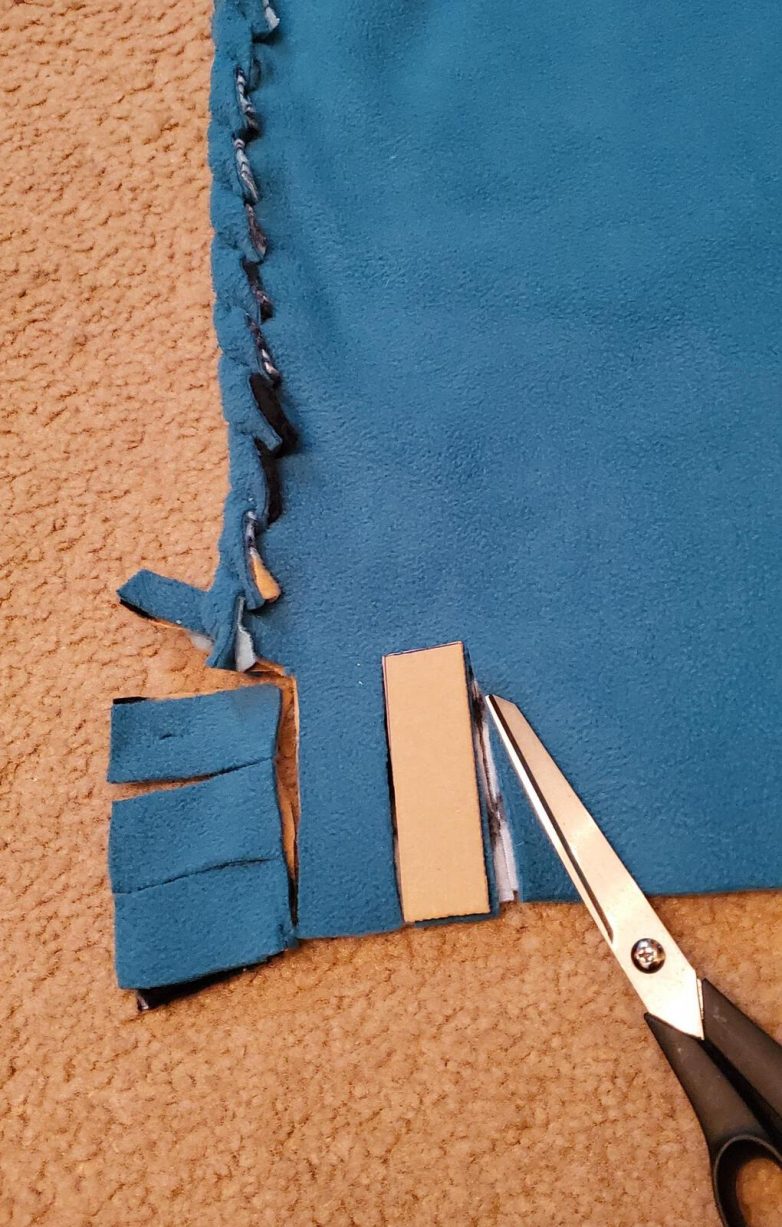 В первую очередь обрежьте три не заплетенных сегмента широкой бахромы. Использую шаблон, прорезайте оба слоя ткани, точно также как делали это при работе с широкой стороной пледа.