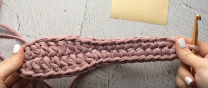 Вязание завернется, повторите все в обратном порядке. В последнюю петлю провяжите 2 столбика без накида (прибавка). Соедините ряд столбиком без накида.