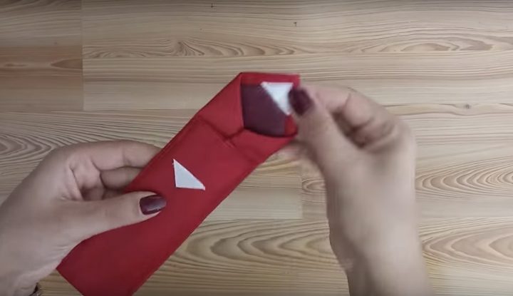 На открытом крае подогните ткань внутрь и прошейте. Сложите галстук в виде вытянутого конверта, сшейте боковые стороны.
