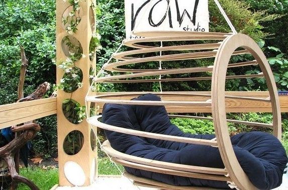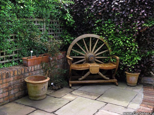 Уютная скамья со спинкой в виде колеса.
