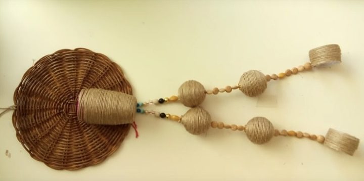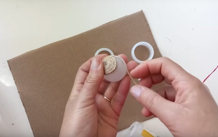 Смажьте пластик вокруг отверстия горячим клеем, приклейте тонкий джутовый шнур и оберните им весь шарик, подклеивая нитку на силиконовый клей. Сделайте четыре таких шариков.
