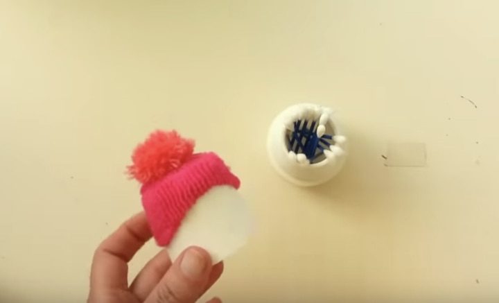 На крышечку наденьте тканевую резинку для волос, зафиксируйте ее на клей. Сверху приклейте маленький помпон.
