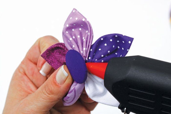 С помощью горячего клея приклеиваем лепестки к обратной стороне пуговицы (можно заранее сделать подкладку для задней части, для удобства и большей эстетики):