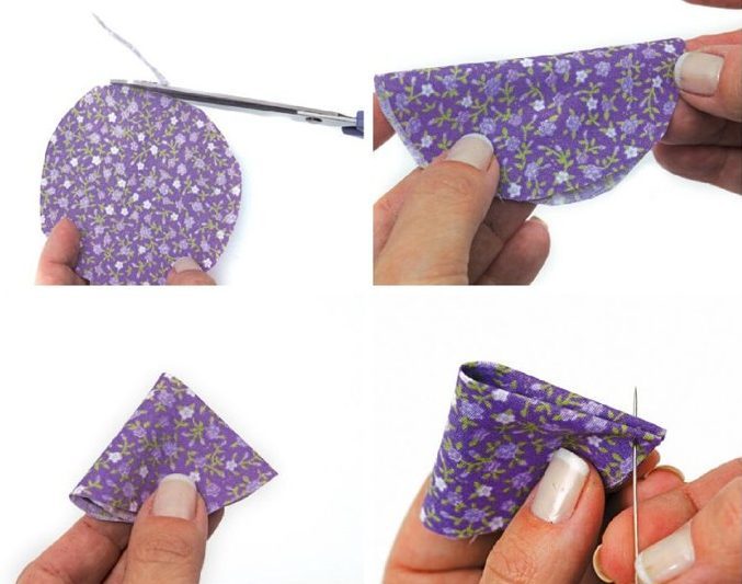 Разрежьте ткань на одинаковые кружочки. Сложите каждый кружок пополам (лицевой стороной наружу), затем ещё раз пополам. Начинаем собирать низ: