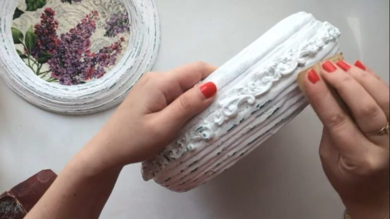 Далее на горячий клей-пистолет приклейте газетные трубочки вокруг будущей шкатулки.