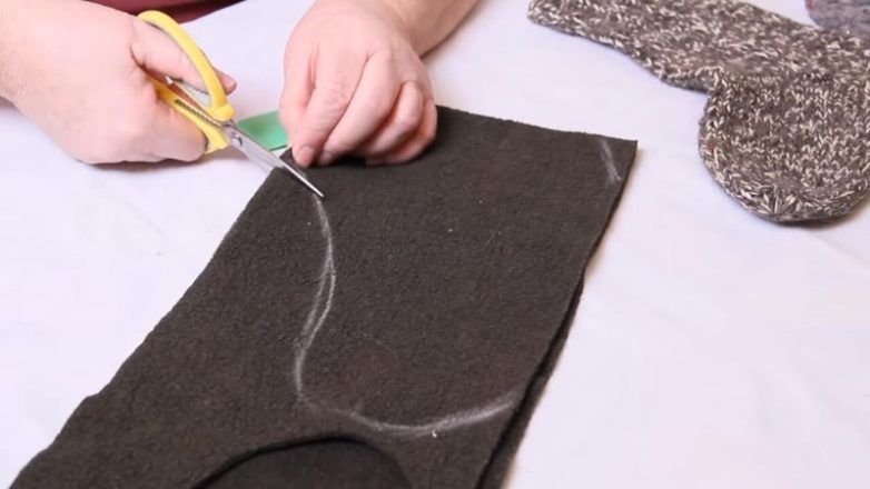 Чтобы сшить чуни, потребуется сделать выкройку. Проще всего её сделать с помощью вязаного носка: просто приложите его к сложенному вдвое шарфу.