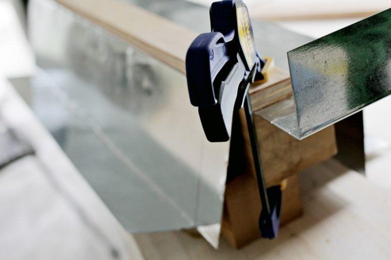 Чтобы качественно согнуть листовой металл, может понадобиться немного практики и терпения. Чтобы загибать лист было проще, нужно воспользоваться деревянным бруском, который укладывается вдоль линии разметки. Благодаря бруску, загиб получается аккуратным и ровным. Чтобы брусок оставался на месте, его можно зафиксировать на верстаке с помощью шурупов.
