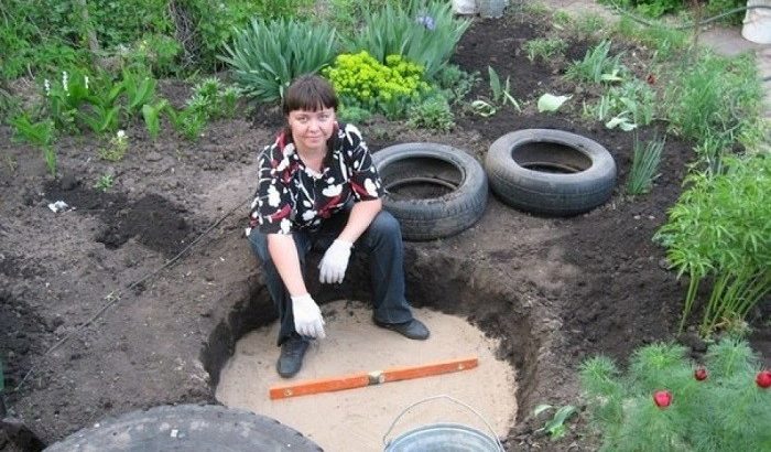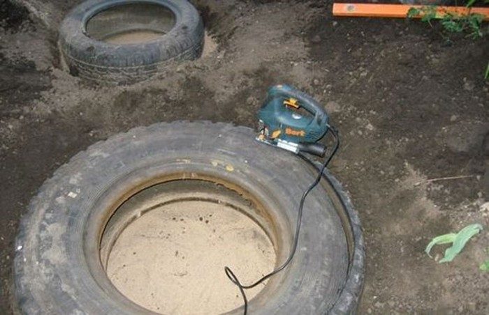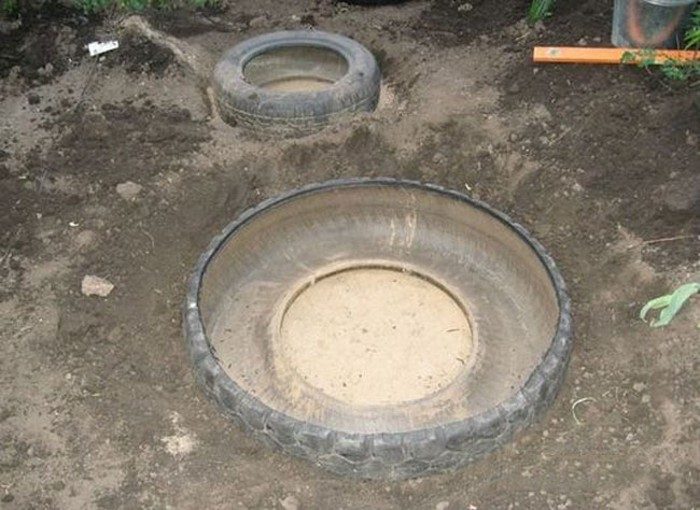 Выкопайте отверстие для каждой шины и рассыпьте слой песка снизу.