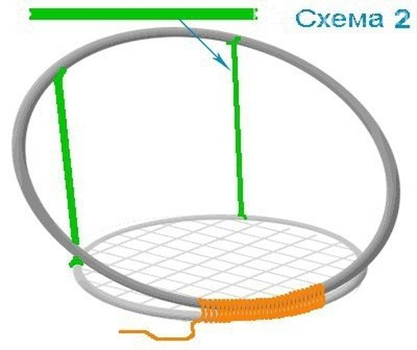3. Обручи соединяются между собой при помощи деревянной штанги и толстого шнура. Затем следует так же сплести спинку.