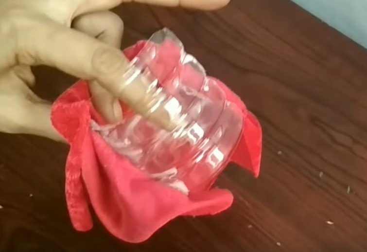 Нанесите термоклей по всей наружной поверхности бутылок и оклейте их тканью.