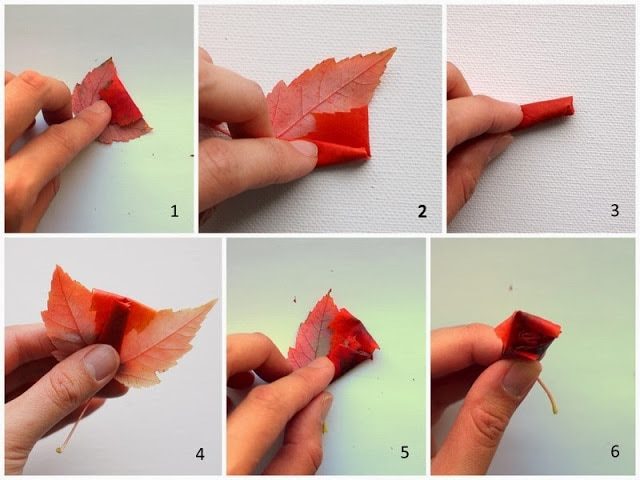 Отсортируйте листья от самых маленьких до самых больших. Один из самых маленьких листочков сложите пополам, яркой стороной наружу. Сверните в маленькую трубочку.