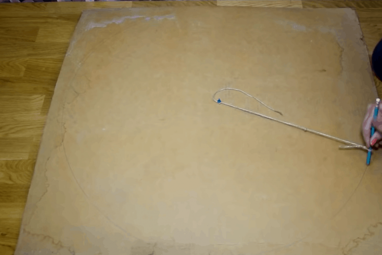 Закрепив кнопку по центру, делаем петлю с одного боку нити, а ко второй привязываем карандаш. Получаем примитивный циркуль и прочерчиваем с его помощью окружность.