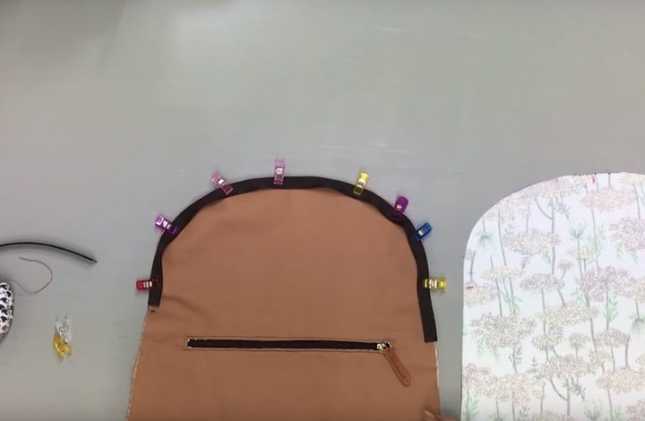 Разберите молнию. Закрепите лицевой стороной к основе. Сверху приложите подклад, также лицевой стороной к деталям. Прошейте по всей длине. Выверните. Повторите со второй частью молнии и другими деталями основы. Прогладьте. Сделайте дополнительный шов вокруг молнии.