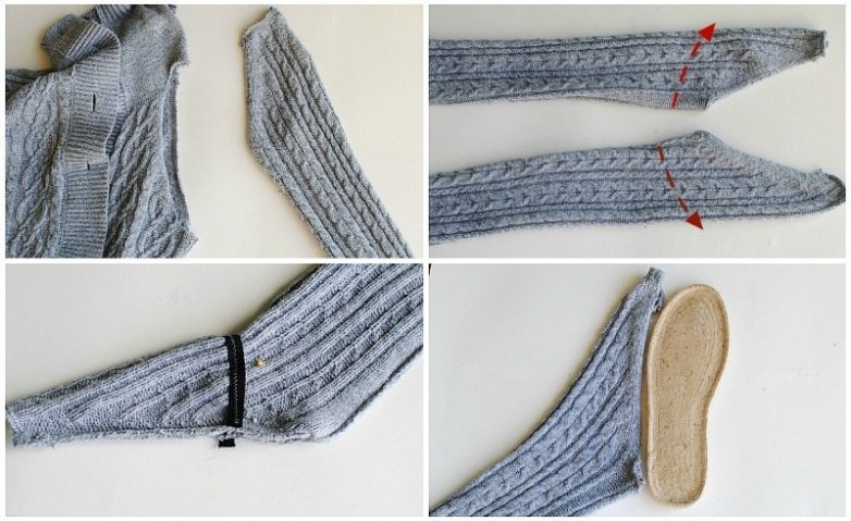 Когда из свитеров и кофт мы выбрали жертву, отрезаем у нее рукава, нам понадобятся только они. Обрезать нужно чуть ниже шва, так чтобы шов остался на рукаве, который мы позже превратим в сапожок. Это нужно для того, чтобы ткань «не поползла».