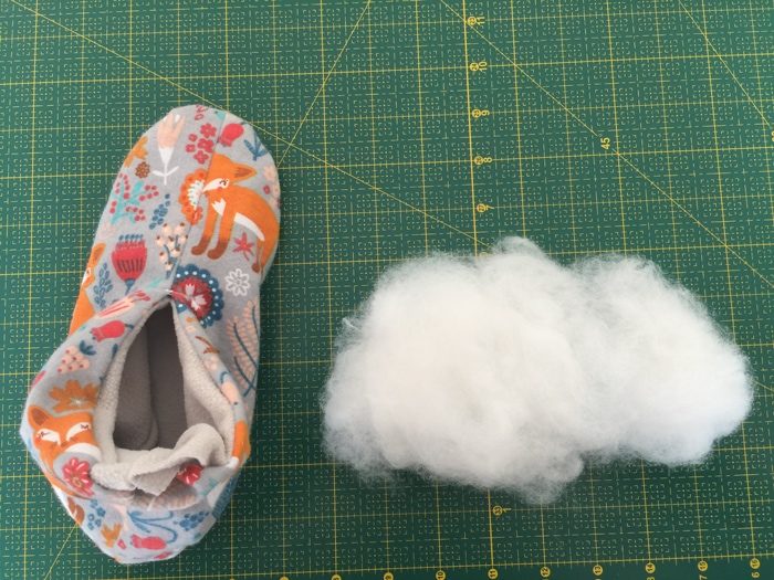 Если решили шить тапочки с ватином, равномерно распределите теплоизолирующий материал внутри тапочек.