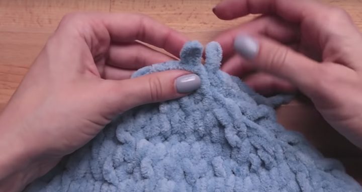 Чтобы закрыть вязание, несколько следующих петель на нитке разрежьте у основания. Протяните дальнюю петлю через находящуюся правее, продолжайте протягивать ее сверху, пока не останется одна петля.