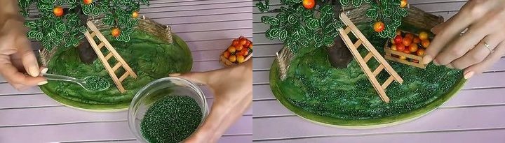 Основание раскрасить, с помощью клея и бисера создать эффект травки, укрепить декоративную лесенку из палочек для мороженого и ящичек с яблоками.