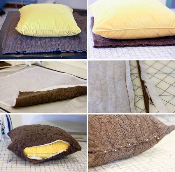А если вы не обладаете навыком вязания или хотите побыстрей украсить свой диван в гостиной декоративными подушками, то можете использовать старый вязаный свитер и пошить подушки своими руками, следуя за пошаговой инструкцией ниже.