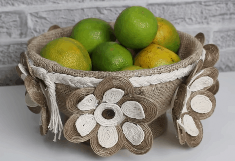 Пускаем по кругу окантовку из шнура. По сути корзина для фруктов готова. Остается лишь украсить ее.