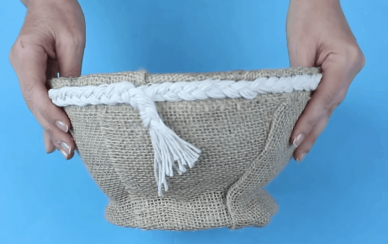 Все, что понадобилось для реализации идеи, это небольшой кусок мешковины, немного шнура 2 цветов, клей и канцелярский файл.