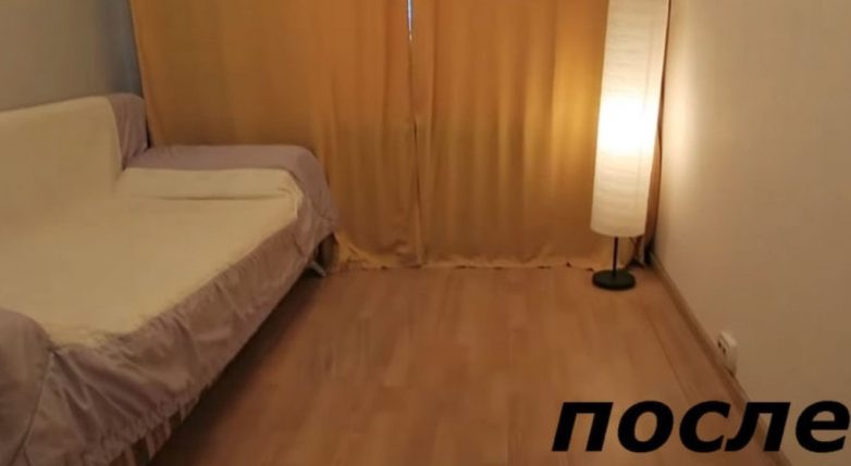 Для декора девушка нашла на барахолке дешевые шторы, напольную лампу и плед для дивана. В магазине был куплен недорогой узкий коврик, подходящий по цвету всей комнате, — его она постелила перед диваном.